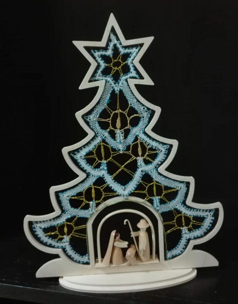 Struttura di legno leggero ed interno in tombolo lavorato con filo di lino. Misure cm 25×15 circa.