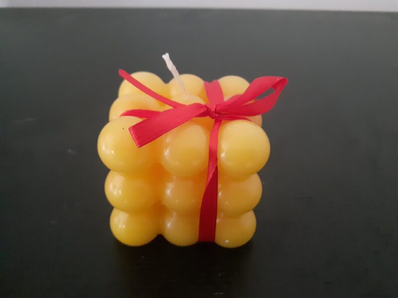 candela in cera d’api di forma cubica ma realizzata a piccole palle