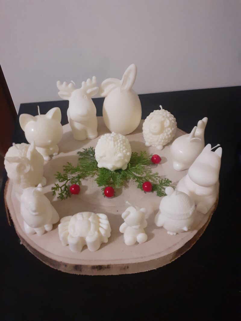 Centrotavola con animaletti candela: gufo, riccio, pecora, renna, coniglio, ippopotamo, gatto, orsetto pulcino, granchio, unicorno e delfino. Tutte candele in cera di soia