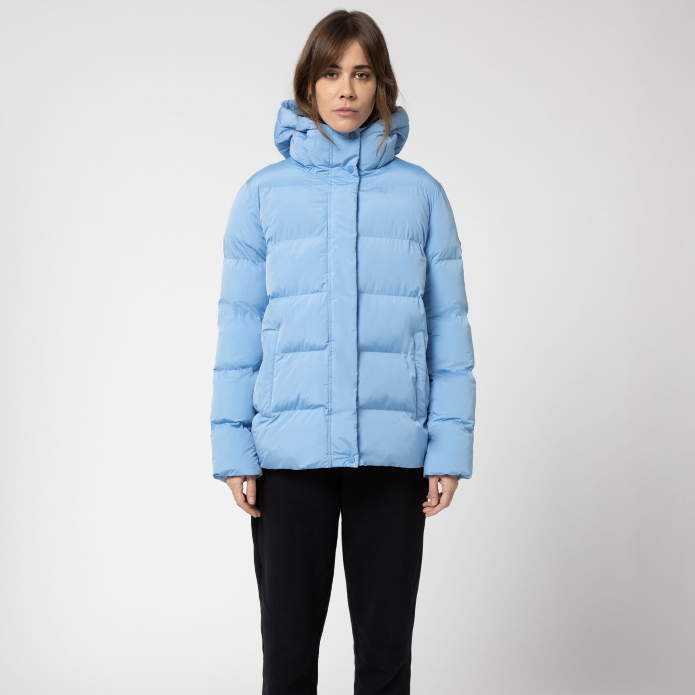 Piumino azzurro corto con cappuccio realizzato in tessuto poly downproof.
