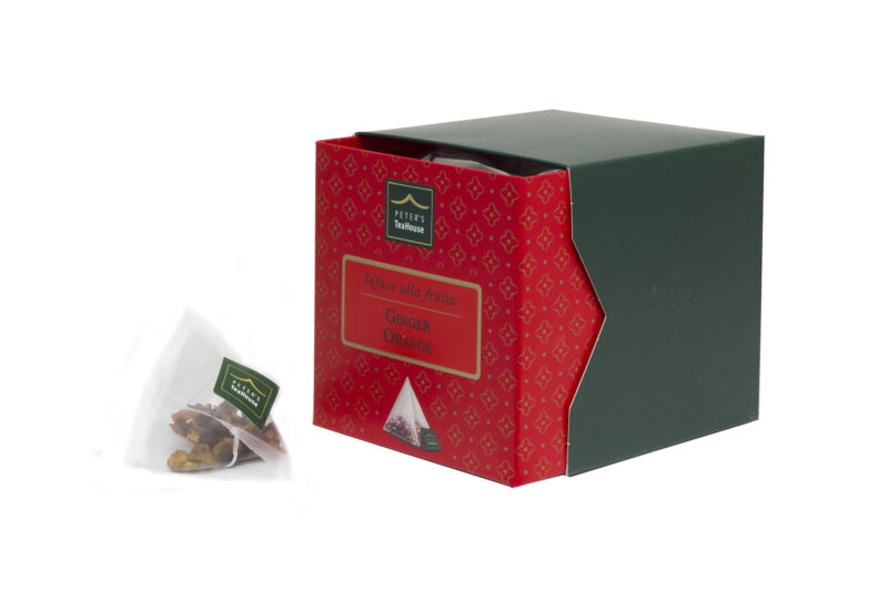 Cofanetto Pyramid Tea con 15 filtri piramidali. Un delizioso infuso, che unisce il gusto agrumato dell’arancia alle piacevoli note piccanti dello zenzero. I filtri piramidali sono biodegradabili, prodotti con materiale proveniente dal mais.