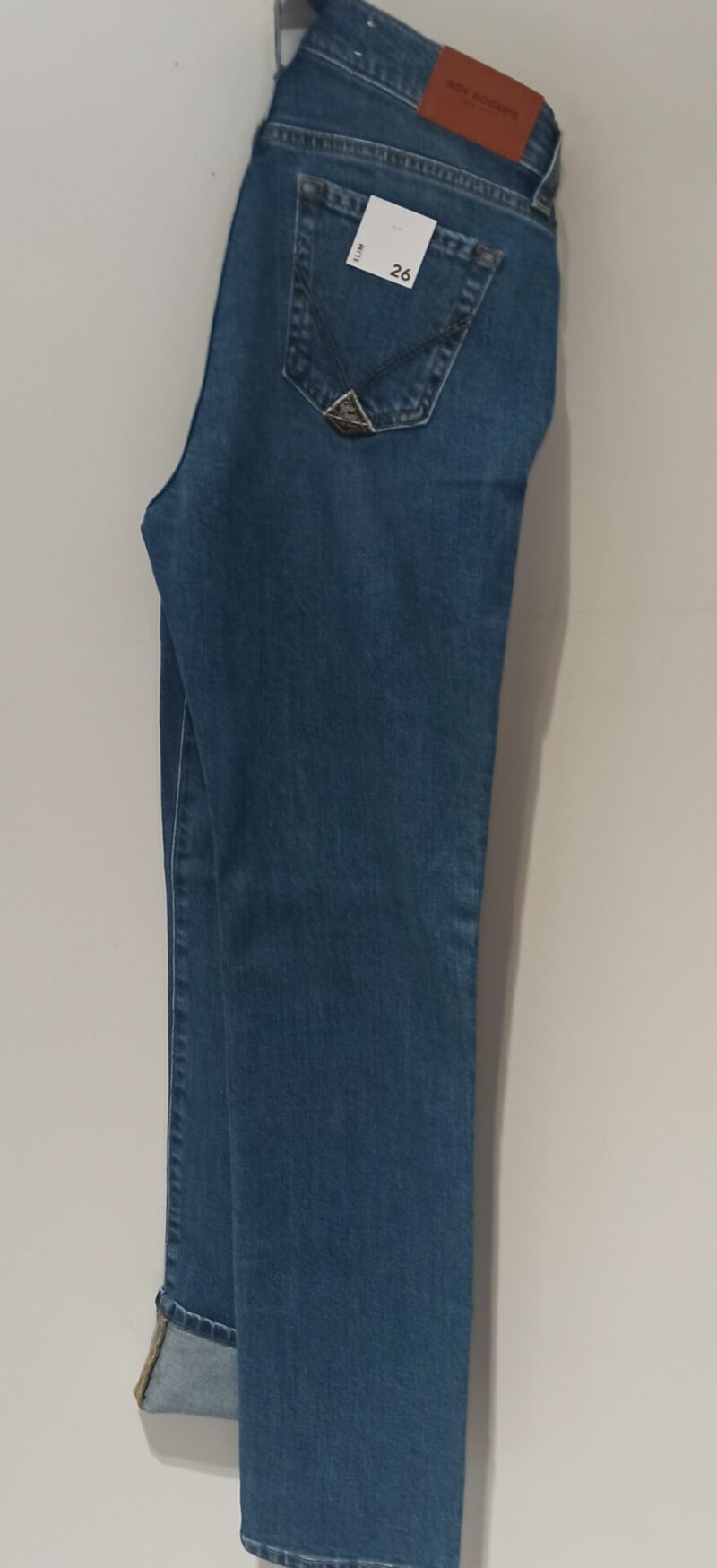 Jeans in denim con lavaggio scuro. Vita media con passanti e salpa applicata sul retro. Chiusura con bottone logato e zip. Due tasche sul fronte e due tasche sul retro con label Roy Roger’s applicata. Slim fit. COMPOSIZIONE: 98% COTONE 2% ELASTAN.