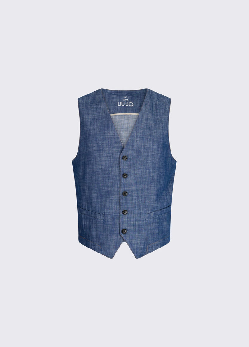 Descrizione Gilet da uomo in denim chambray Tasche a filetto Chiusura con bottoni Fibbia posteriore in tono colore