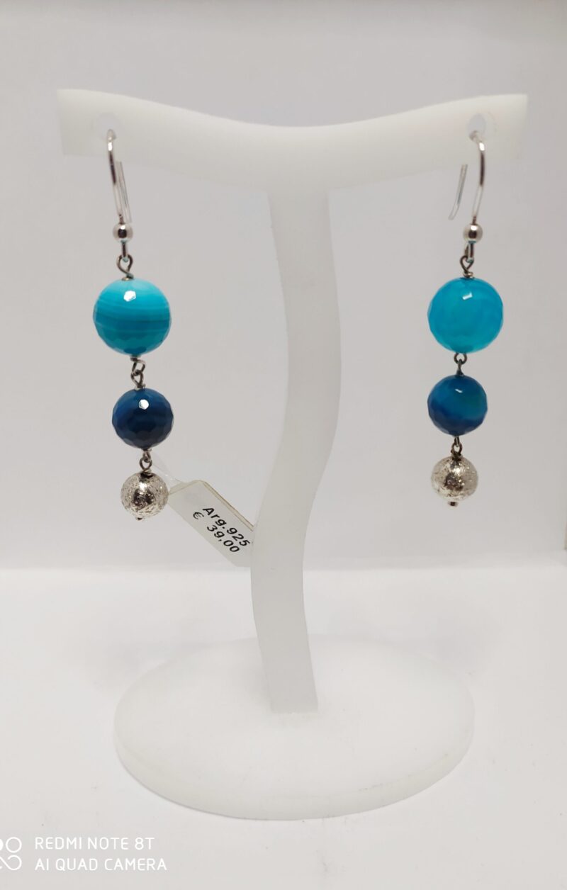 Home | , | Orecchini pendenti in Argento 925/000, con 6 palline a gradazione discendente, di cui 4 in quarzo naturale colre azzurro e blu, e 2 in argento.