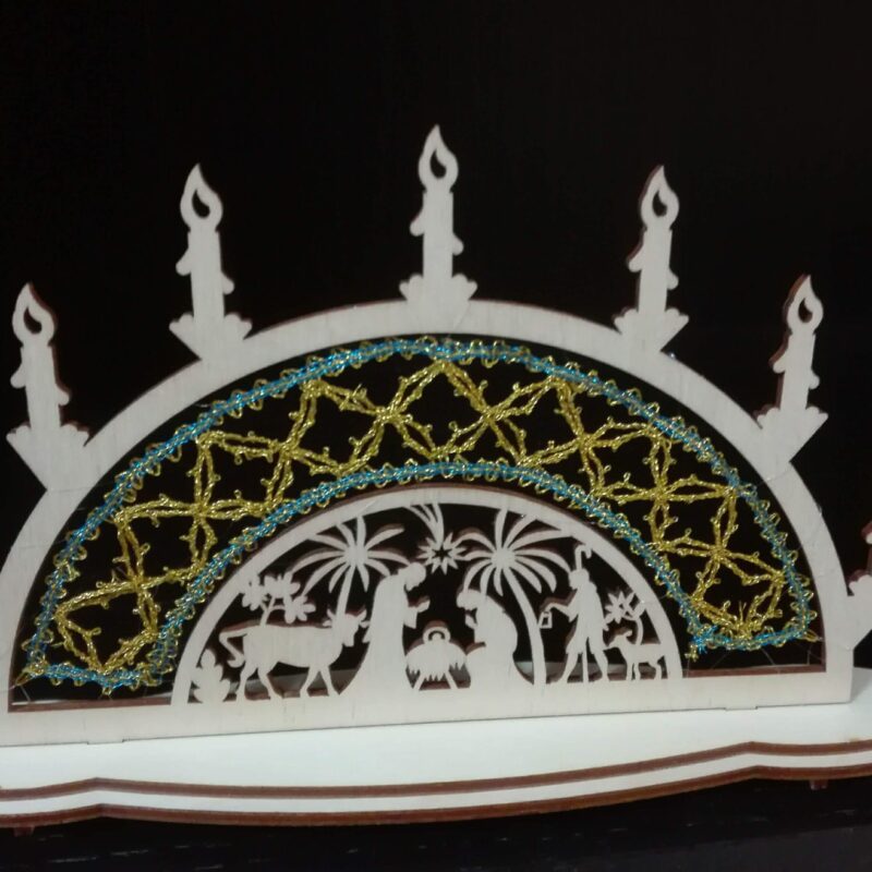 Presepe in legno leggero con interno in tombolo. Misura cm 22 x 13.