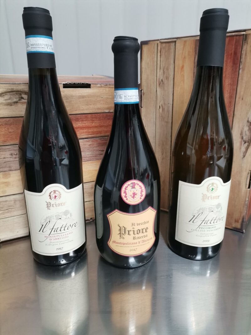 1 bottiglia “Il Vecchio Priore” Montepulciano d’Abruzzo € 16,90 1 bottiglia “ Il Fattore” Montepulciano d’Abruzzo € 10,90 1 bottiglia “Il Fattore” pecorino. €10,90